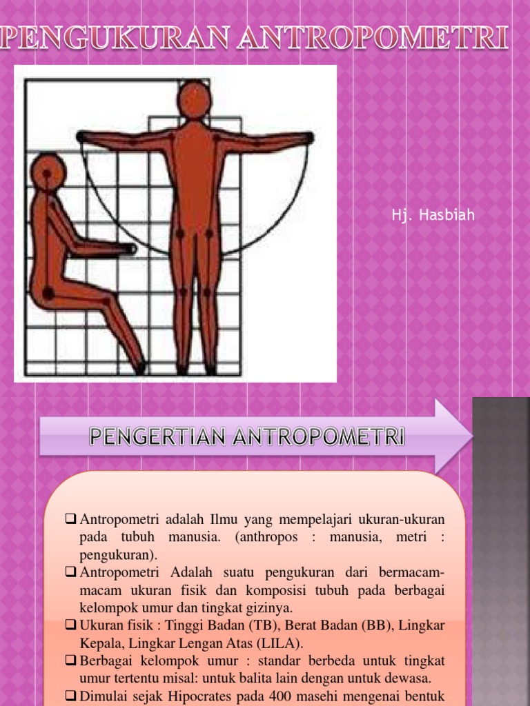 Jadi antropometri adalah ukuran tubuh. Pengukuran antropometri merupakan indikasi pertumbuhan yang berkaitan dengan perkembangan seseorang apakah normal atau tidak terkait dengan status gizi seseorang. Anthoropos artinya tubuh dan metros artinya ukuran.