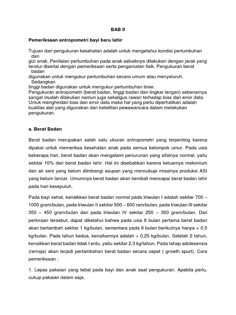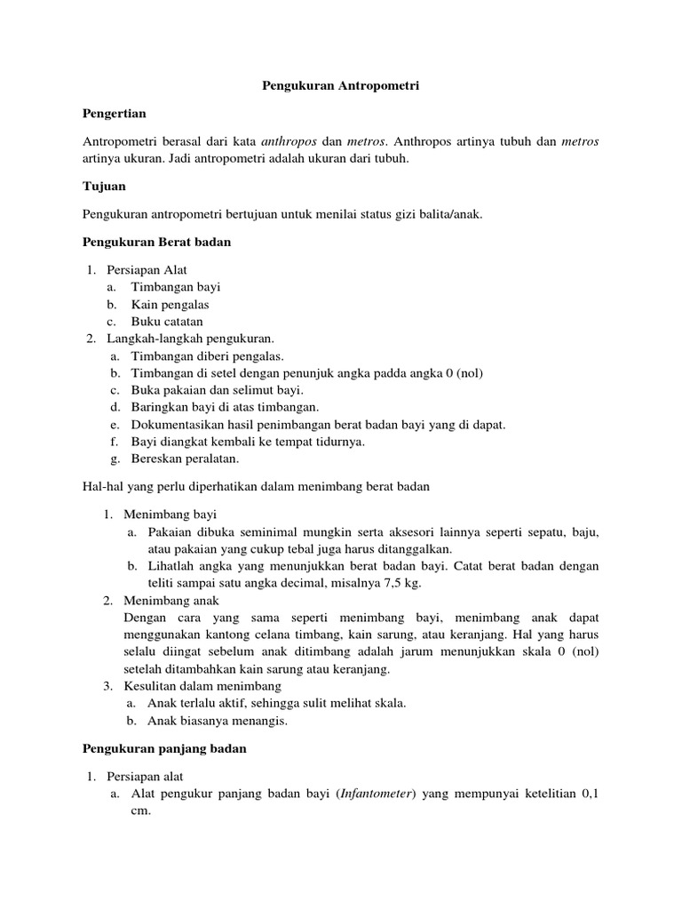Agar hasil pengukuran representatif maka pengukuran harus dilakukan dengan metode tertentu terhadap berbagai individu dan tubuh harus dalam keadaan diam. Pengukuran antropometri pengganti untuk mendeteksi kasus bblr di kota pontianak dan kabupaten kubu raya tahun 2011 tesis wahyu kurnia yusrin putra npm. Pengukuran antropometri dilakukan dengan mengkur berat badan menggunakan timbangan mengukur panjang bayi pada papan pengukur infantometer dan tinggi badan anak diatas 2 tahun dengan berdiri diukur dengan stadiometer.
