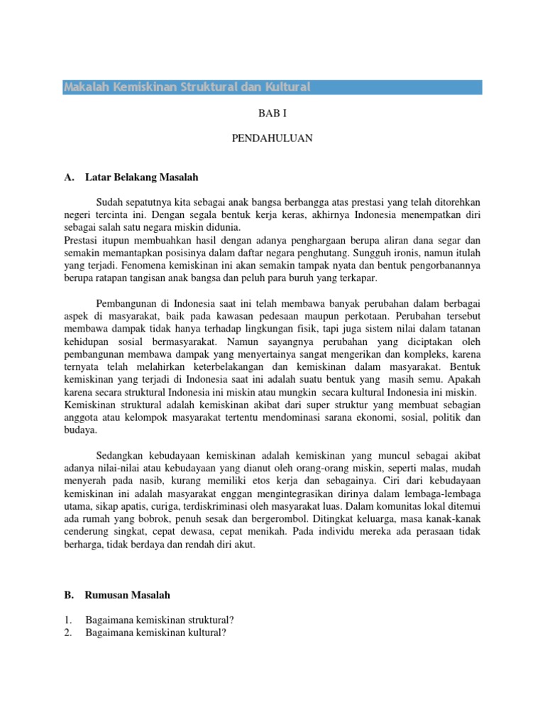 Makalah Kemiskinan - Jika dalam postingan ini. Contoh Kemiskinan Kultural dan Struktural Untuk memperjelasanya terkait penjelasan tersebut berikut adalah contoh kemiskinan kultural dan struktural yang ada di masyarakat diantaranya. 5 kemiskinan yang dialami oleh seorang individu oleh karena dia malas bekerja atau oleh karena dia terus-menerus sakit maka kemiskinan yang demikian adalah bersifat individual sedangkan.