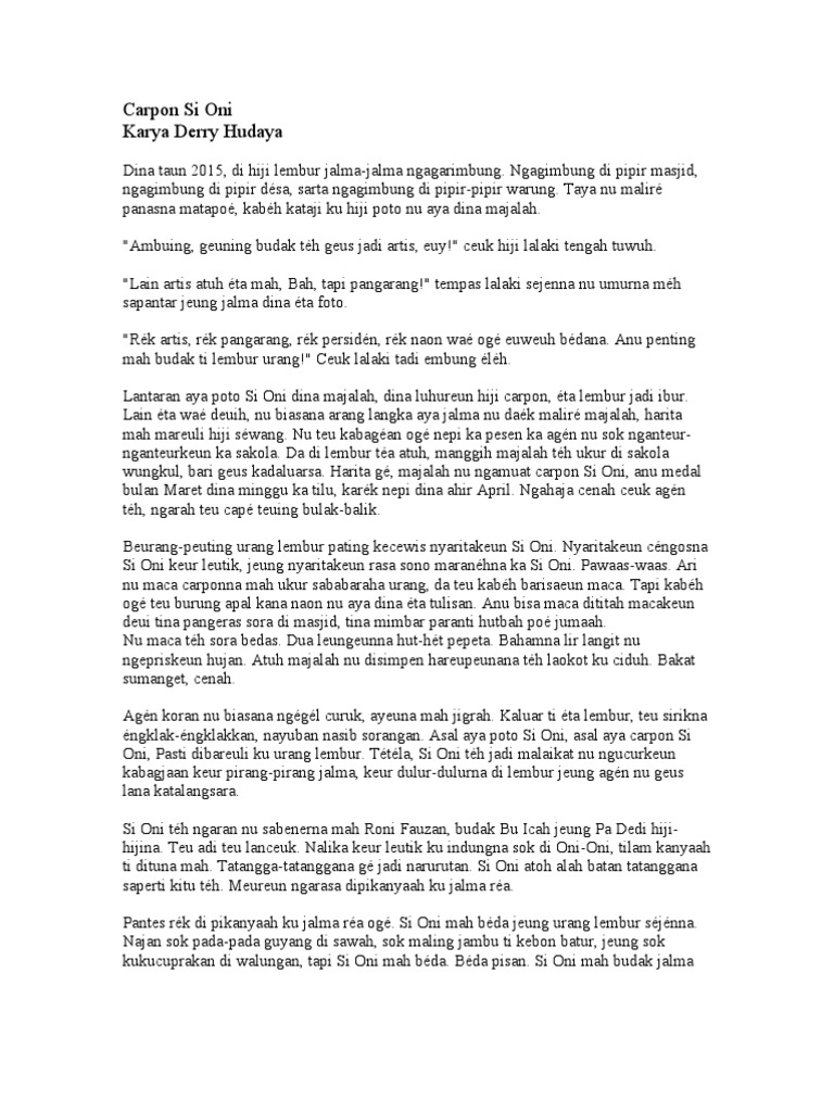 Selain menghibur tentunya membaca carpon Sunda juga akan menambah kosa kata dalam berbahasa Sunda. Di desa Legok Hanyir teh aya susukan ageung caina herang susukan eta sok dianggo kagiatan mandi cuci kakus ku warga tapi susukan eta teh kawanoh. Mulai dari cerpen tentang persahabatan cerpen bahasa sunda tentang cinta carpon sunda sedih carpon sunda misteri carpon sunda lucu.